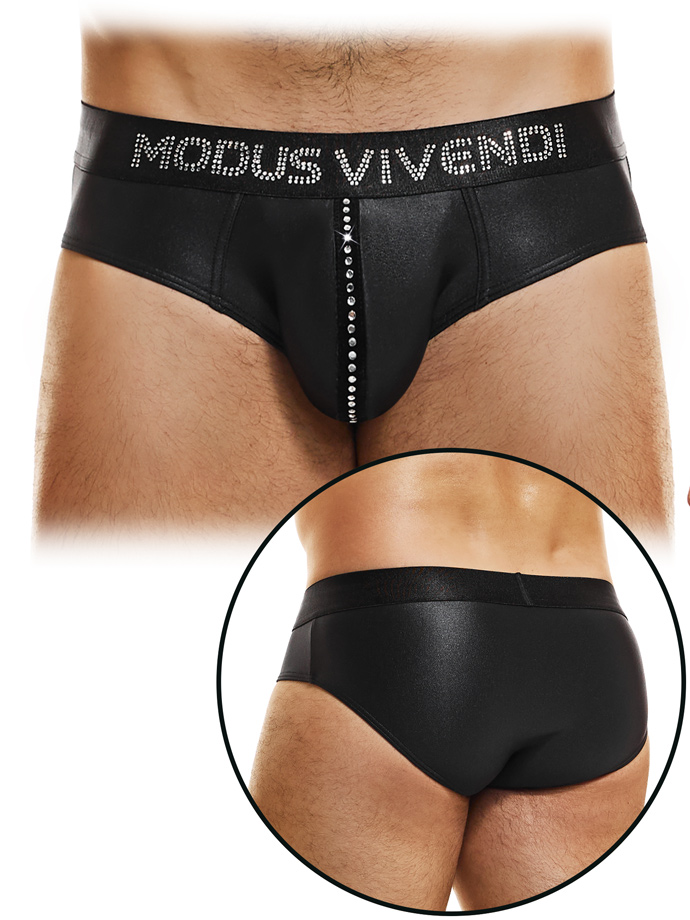Le Slip Classique Flashy s'adapte parfaitement à votre corps et la large bande élastique, avec son logo Modus Vivendi accrocheur en pierres de cristal thermoformées, repose confortablement sur vos hanches pour vous assurer le meilleur confort possible. La partie latérale de ce slip est agréablement large pour mettre en valeur vos jambes et souligner visuellement la poche avant.