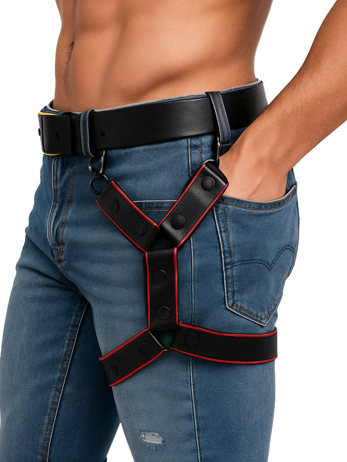 Tu veux attirer l'attention et faire une déclaration ? Alors le Leg Harness rouge avec bande en cuir noir est l'accessoire idéal pour toi. Le contraste de couleurs saisissant capte immédiatement tous les regards et souligne ta masculinité, que ce soit au quotidien ou lors d'événements spéciaux.