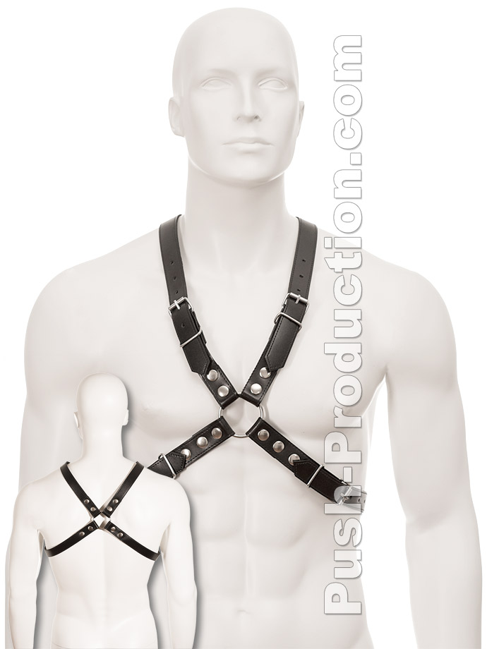 Ce harnais pour torse a une forme de X, tenue idéale pour les clubs et les parades. Les sangles sont lisses des deux côtés et cousues tout le long du bord.