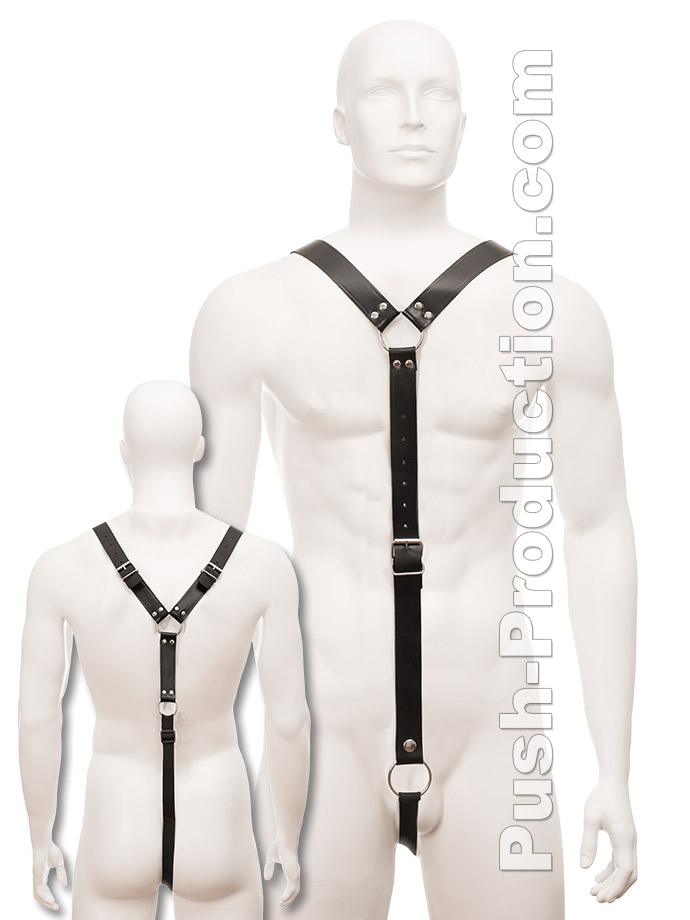 Harnais pour homme en forme de Y fait de lanières de cuir et avec des sangles élastiques. D’un côté, le harnais possède sur la partie haute des anneaux de jonction et la partie basse se compose d’une lanière plus longue. Si vous portez ce côté devant, il est possible d’utiliser l’anneau de jonction le plus bas en guise de cockring. Ce dernier a un diamètre interne de 4,4 cm. Les bandes en cuir font le tour de votre corps sous le pénis et entre les fesses, et se règle facilement pour l'adapter à votre taille. Diamètre interne cockring : env. 4,4 cmLargeur des lanières : env. 3 cmMatière : cuir, métalCouleur : noir