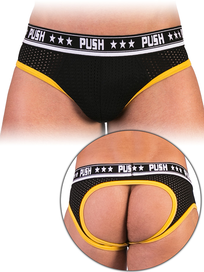 Avec le slip Premium Mesh Hole de PUSH, vous allez enfin pouvoir montrer votre côté sexy où que vous soyez ! Ce slip noir et jaune PUSH au design soigné combine une poche frontale moulante, une fenêtre sur vos fesses nues et une ceinture amincissante qui en font un sous-vêtement polyvalent et sexy pour l’homme moderne.La poche frontale moule votre paquet tout en le maintenant confortablement en place pour une sensation douillette toute la journée. Le tissu en mailles micro-perforées Mesh s’adapte tout seul à votre anatomie grâce à sa haute flexibilité et cache juste vos parties sensibles. Des centaines de petits trous assurent une circulation de l’air optimale et laissent votre peau respirer. La poche frontale à double couche empêche d’apercevoir votre engin, mais partout ailleurs, les mailles perforées permettent aux autres de voir d’agréables bouts de peau.La ceinture est douce, large et hautement flexible, reliée à la texture en mailles par des coutures plates. La ceinture et les contours de jambes offrent un contraste jaune plaisant, tiennent bien en place et bénéficient d’une double couture. Détails du produit : ✓ Nouvelle gamme des sous-vêtements sexys PUSH.✓ Fait en tissu à mailles micro-perforées Mesh de haute qualité.✓ A des coutures plates et non visibles.✓ Inclut des couleurs contrastantes à la ceinture et aux contours de jambes.✓ Possède une poche frontale moulante, sexy, mais qui cache votre engin.✓ Aucun badge, poche ou rembourrage cachés.✓ Fabriqué en Europe, dessiné à Berlin. Instructions d’entretien : laver à la main ou en machine jusqu’à 30°C, sans javel, passer au sèche-linge à basse température, ne pas repasser, ne pas nettoyer à secMatière : 78% polyamide, 22% élasthaneCouleur : noir et jaune