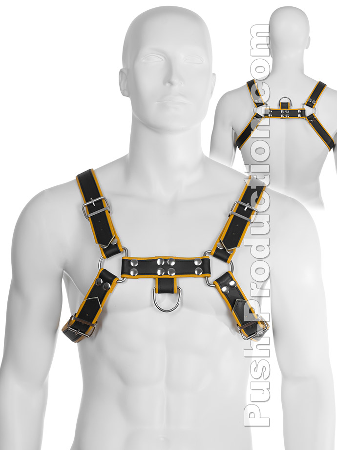 Le harnais BDSM robuste en cuir véritable noir et jaune est conçu pour votre plaisir sauvage lors de défilés, soirées à thèmes ou en club.Lorsque vous êtes pris en levrette, vous vous demandez souvent où mettre vos mains ? Suggestion : portez ce harnais et laissez votre partenaire vous prendre par derrière. Il peut gérer les sangles comme des rênes et prend pleinement le contrôle de la situation.Les lanières de cuir sont de très haute qualité, la couleur ne déteint pas. Les sangles sont faites de deux types de cuir. L'extérieur est en cuir plus rigide noir mat. Les bords pliés et l'intérieur sont en cuir souple pour un meilleur confort.Toutes les sangles ont environ 3,3 cm de large. Le harnais BDSM peut être ajusté de la taille S à XXL grâce à ses quatre boucles.Les boucles peuvent être portées sur la poitrine ou sur le dos, selon votre goût.Les raccords métalliques en acier inoxydable sont tous lisses et robustes. On remarque immédiatement que ce harnais a été produit pour l'usage intensif et professionnel dans le BDSM.Le harnais peut être retourné de sorte que les anneaux en D pointent vers le haut ou vers le bas. Et cela des deux côtés. Personnellement, nous vous recommandons de porter l'anneau en D vers le bas - il est plus facile de tirer votre esclave avec une chaîne. Ce harnais est un immanquable pour votre collection BDSM.Largeur des sangles : env. 3,3 cmMatériau : cuir véritable, acier inoxydableCouleur : noir, jaune