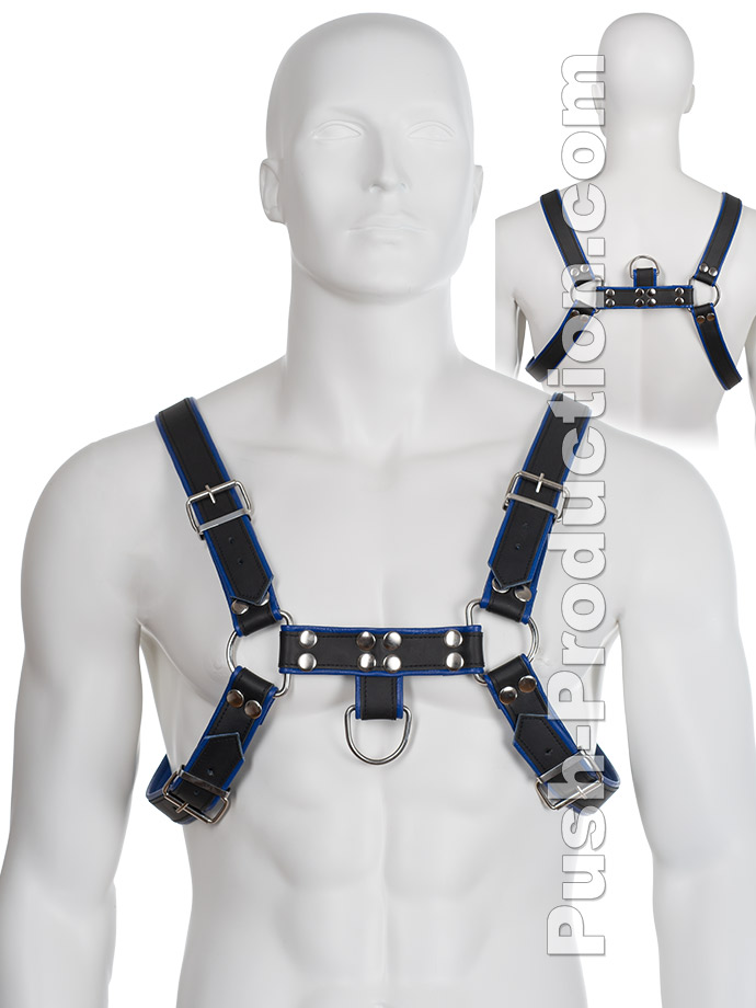 Le harnais BDSM robuste en cuir véritable noir et bleu est conçu pour votre plaisir sauvage lors de défilés, soirées à thèmes ou en club.Lorsque vous êtes pris en levrette, vous vous demandez souvent où mettre vos mains ? Suggestion : portez ce harnais et laissez votre partenaire vous prendre par derrière. Il peut gérer les sangles comme des rênes et prend pleinement le contrôle de la situation.Les lanières de cuir sont de très haute qualité, la couleur ne déteint pas. Les sangles sont faites de deux types de cuir. L'extérieur est en cuir plus rigide noir mat. Les bords pliés et l'intérieur sont en cuir souple pour un meilleur confort.Toutes les sangles ont environ 3,3 cm de large. Le harnais BDSM peut être ajusté de la taille S à XXL grâce à ses quatre boucles.Les boucles peuvent être portées sur la poitrine ou sur le dos, selon votre goût.Les raccords métalliques en acier inoxydable sont tous lisses et robustes. On remarque immédiatement que ce harnais a été produit pour l'usage intensif et professionnel dans le BDSM.Le harnais peut être retourné de sorte que les anneaux en D pointent vers le haut ou vers le bas. Et cela des deux côtés. Personnellement, nous vous recommandons de porter l'anneau en D vers le bas - il est plus facile de tirer votre esclave avec une chaîne. Ce harnais est un immanquable pour votre collection BDSM.Largeur des sangles : env. 3,3 cmMatériau : cuir véritable, acier inoxydableCouleur : noir, bleu