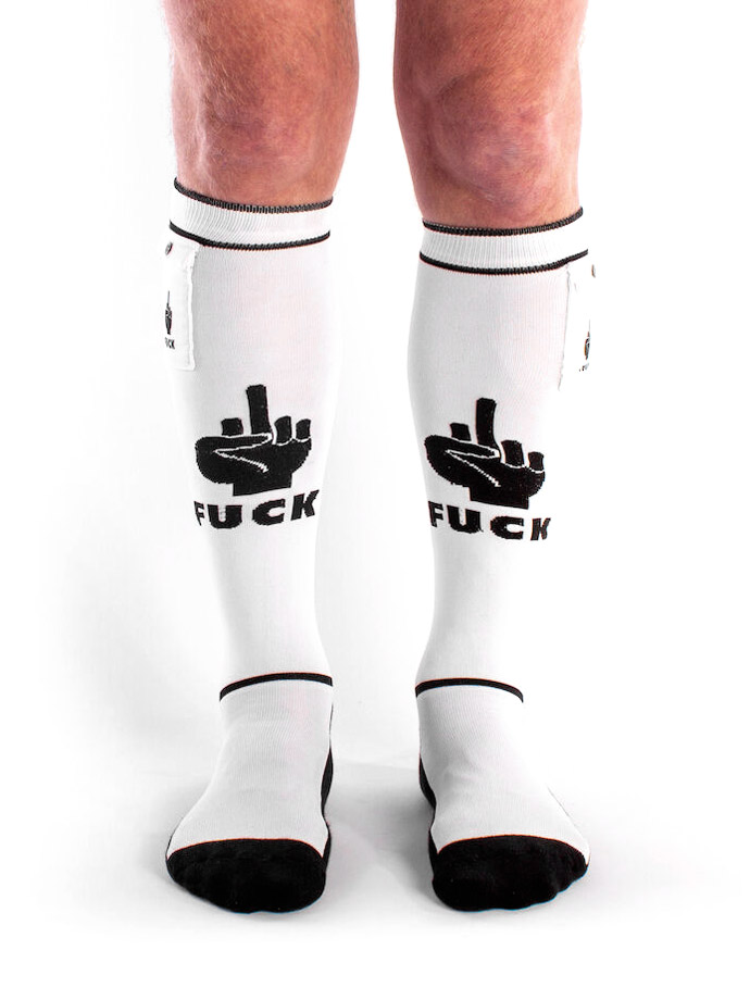 Mettez-vous d'humeur à faire des trucs coquins avec ces chaussettes "Fuck" Party Socks de Brutus, hautes jusqu'aux genoux, en blanc, pour compléter la tenue fétichiste parfaite et, selon le code mouchoir, faire savoir que vous aimez la masturbation.Fabriquées au Portugal par Brutus, les chaussettes de soirée fétichistes sont conçues pour s'adapter à toutes les tailles. Les chaussettes sont fabriquées avec des matériaux de haute qualité, combinant respiration, élasticité et tissu doux pour un port des plus confortables. Sur le côté de chaque chaussette se trouve une petite poche où vous pouvez ranger poppers, préservatifs, petites fioles de lubrifiant et autres accessoires amusants. Les chaussettes sont disponibles en plusieurs couleurs et motifs pour que vous trouviez celui qui vous convient le mieux pour vous exprimer. Détails du produit :✓ Chaussettes fetish sexy ✓ Hauteur genou ✓ Matière haute qualité ✓ Tissu doux, respirant et élastique ✓ Avec deux poches latérales ✓ Fabriqué au Portugal Entretien : lavage en machine jusqu'à 30°C, ne pas passer au sèche-linge, ne pas utiliser de javel, ne pas repasser, ne pas nettoyer à sec Matière : 80% polyamide, 17% coton, 3% élasthane Couleur : blanc, noirTaille : taille unique