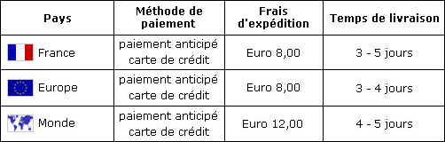 Précision importante : Malgré toutes les précautions, il est possible que des dommages ne surviennent durant le transport. Dans ce cas, nous vous remboursons naturellement l'article endommagé. Procédure : Les dommages de transport doivent être déclarés auprès du fournisseur immédiatement à la livraison de la marchandise. Vous nous informez ensuite par écrit des dommages de transports qui ont été établis. Si vous souhaiter renvoyer la marchandise, veuillez nous en informer à l'avance par e-mail. |